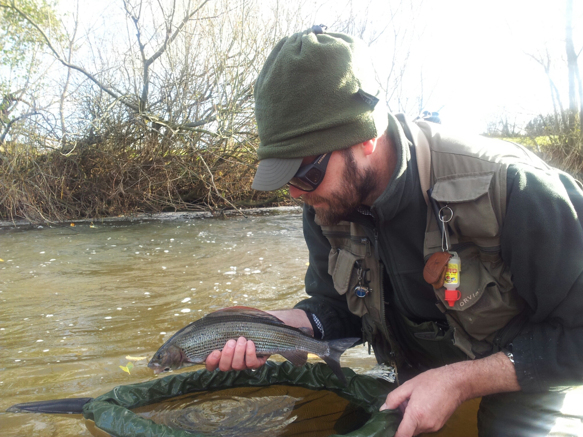 Cheespaste Pete made the journey up to Derbyshire too, again with a new nymphing outfit and with a goal too – a new personal best Grayling, no pressure there then. Pete fished long and hard and very well in patches too, catching Grayling and out of season Brown Trout through the day. His technique sharpened up quickly and I felt sure that at some point he would get a chance at a larger fish. He expertly led his two nymphs through a riffle along a treeline and struck the slightest of twitches on the indicator. After some careful and skillfull guiding of the fish around the trees and through the current we had his new PB Grayling in the net, mission accomplished!