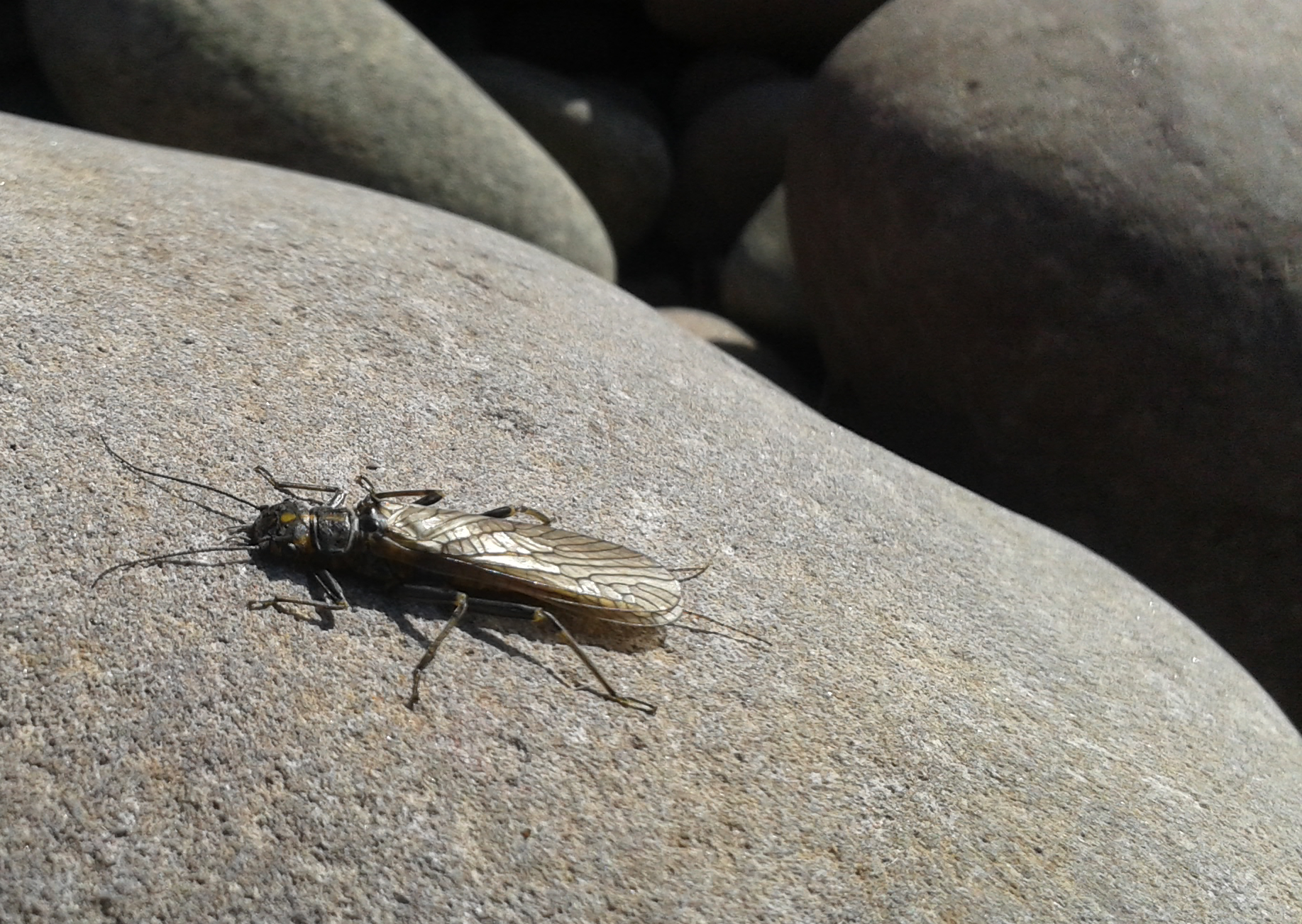 I had wasted the whole hatch and I knew it. Three very cold nights in the tent had taken its toll, I was tired and making mistakes. At around 15:00 there was a sudden but brief flurry of very splashy rises that I covered with no joy. It was only when I sat on some stones at the end of the day contemplating my successes and failures that I noticed a number of very large black stoneflies crawling up the boulders. I flipped some rocks and found a number of stonefly nymphs – no wonder the trout didn’t want my size fourteen gold heads if these guys were in the water.