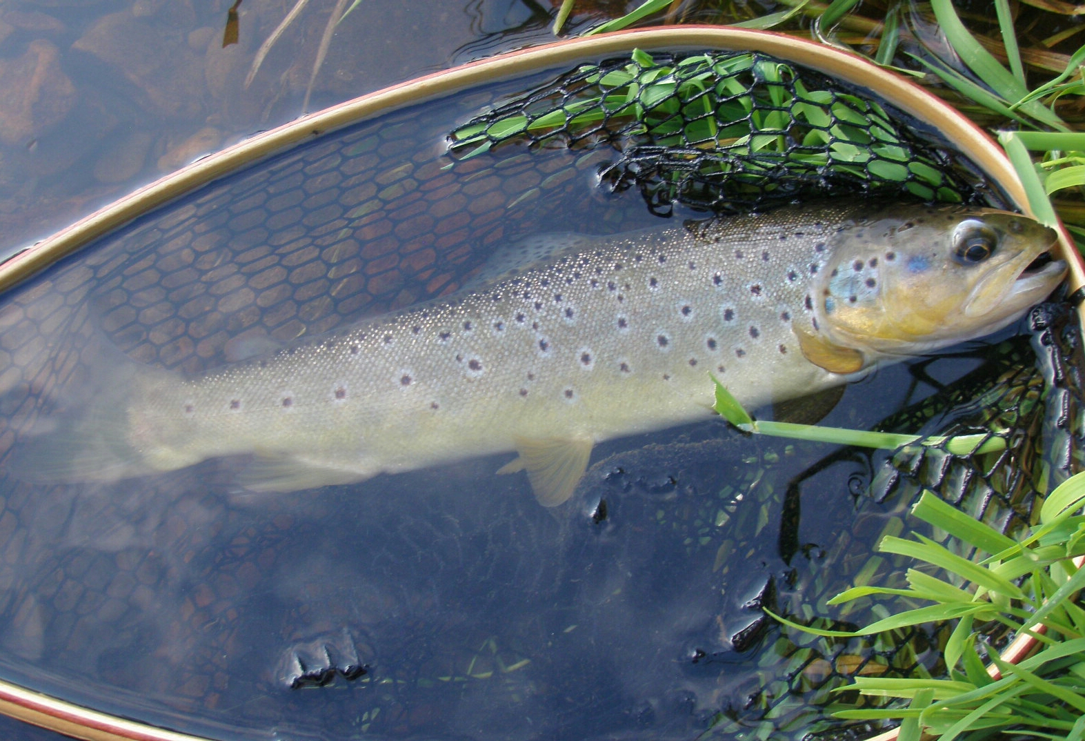 Luckily that was as dramatic as this fight ever became and within half a minute the fish was in the net. At 18″ he won’t break any records but given the river here was less than ten feet wide this is a very significant wild brown trout. For an old fish his condition seemed very good and he took only a few moments to revive before gliding very casually straight back to his position.